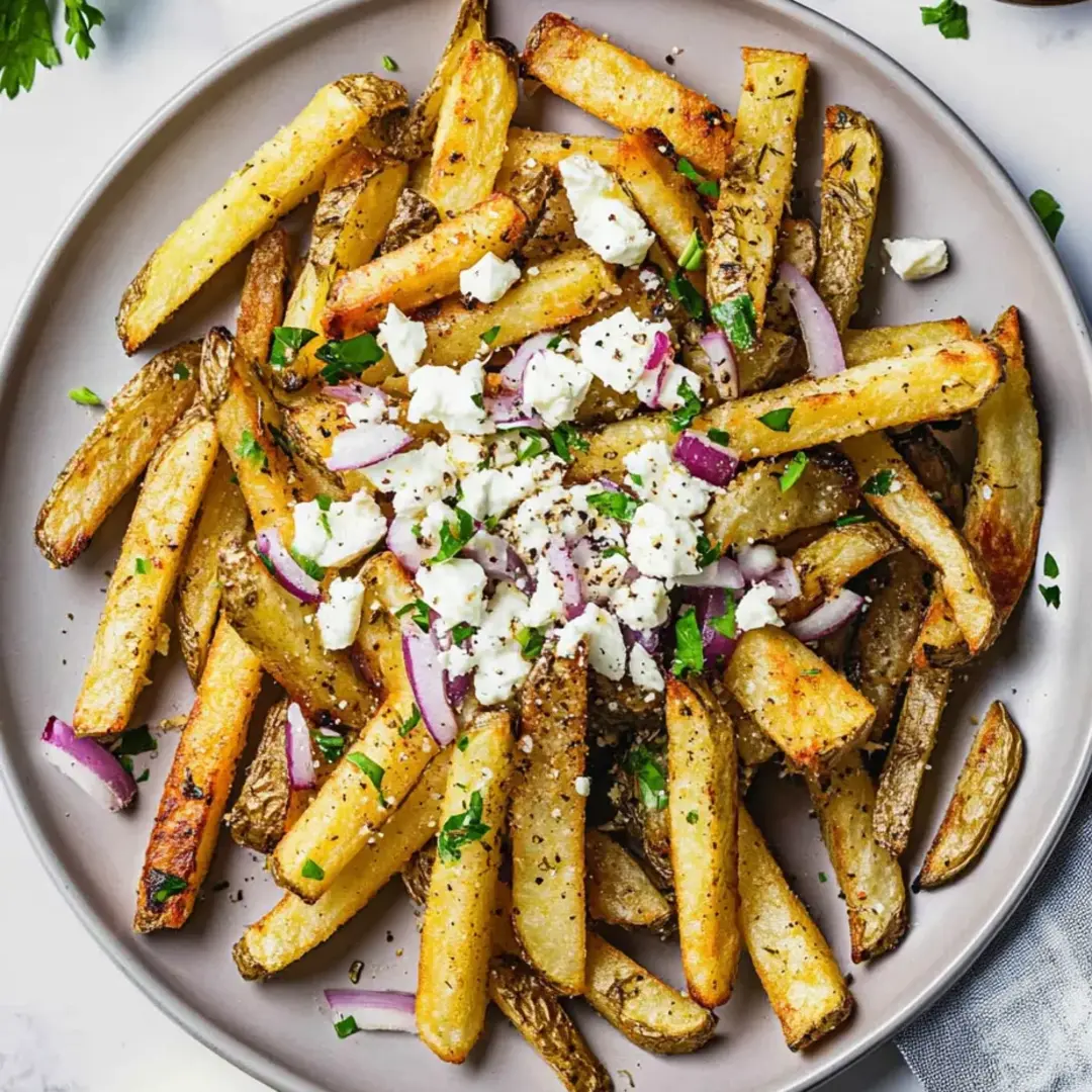 These loaded Greek fries transform ordinary potatoes into something extraordinary with the perfect blend of Mediterranean flavors. Freshly cut Yukon Gold potatoes are seasoned with aromatic herbs like dill and oregano, then topped with tangy crumbled feta cheese, sharp red onion, and bright parsley for a dish that delivers incredible flavor in every bite.