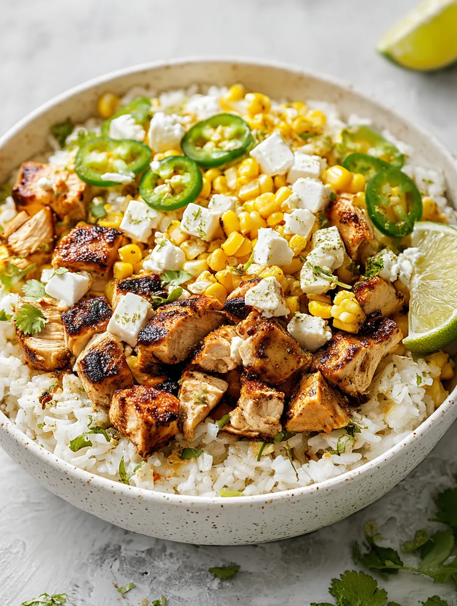 This Street Corn Chicken Rice Bowl is one of those meals I come back to every summer When corn is at its sweetest smoky grilled flavors and creamy cheese all come together in a bowl that feels both fun and comforting Quick to make and hearty enough for everyone at the table this is a regular request in my home
